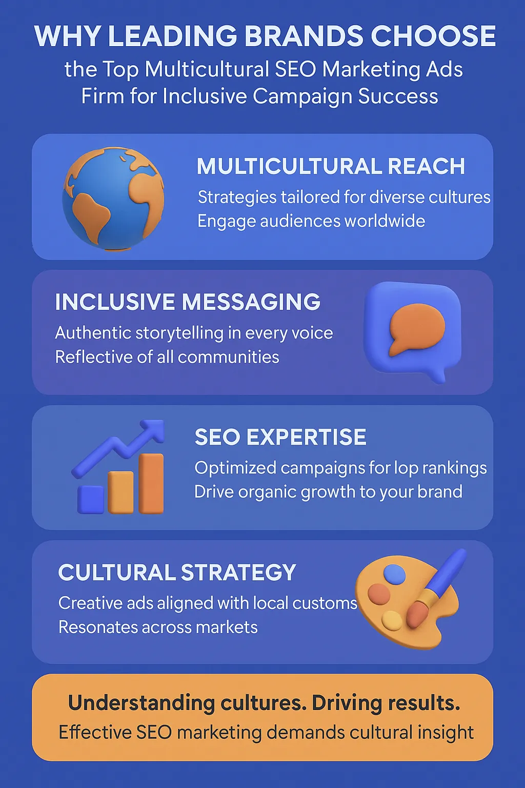 Leading brands understand that inclusive marketing is not a trend—it’s a necessity. That’s why they turn to the top multicultural SEO marketing ads firm, where campaigns are designed to reach audiences across cultures with authenticity and impact.